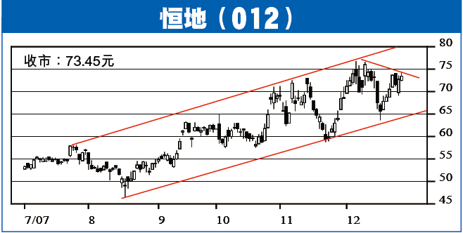 今日建議留意恒地(012),昨以陽燭高收,有勢升穿短期降軌及小型頭肩底阻力,料升破機會不低,下一阻力為平行上升通道頂部79元。