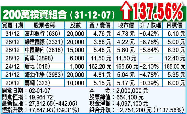 在2007年最後一個交易日,恒指回升442點,總結今年恒指,以開倉時指數計,錄得近40%升幅,而倉內組合,則有137.5%升幅,算是跑贏大市,不過錄得比此升幅更多的炒友,相信為數不少,尤其是一些在中資股狂潮炒輪,而又能及時抽身的朋友。小邱模擬組合堅持不以窩輪為工具,主要是炒輪所涉及的風險,未必人人承受得了,炒衍生工具只會以期指出擊。