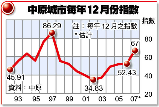 【本報訊】07年樓市買賣氣氛暢旺,造價急升,反映樓市價格變動的中原城市指數預計,在07年底可升抵67點,相對06年底的52.43點,全年上升27.8%,連升5年;其中第4季升幅達16.9%,跑贏同期恒指漲幅。