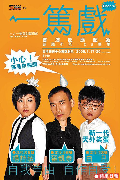 近年港產笑片非常爛,喜劇笑匠無人接棒。劇壇正好相反,大把出色喜劇演員任你揀。07年的《一篤戲》,11個演員分4日轟炸你。今次翻篤,精選白只、楊詩敏、翟凱泰(泰臣)3人獨腳戲,據聞呢3位篤戲觀眾睇得最嘖嘖稱奇,加上另外8位無期。泰臣話:「主腦甄詠蓓貪我哋係撈偏喜劇演員,個性夠怪獸。」你唔講我自己找,發現3人都令觀眾對「喜劇」重新思考。柯南Mode啓動,睇睇3位點解有得留低。