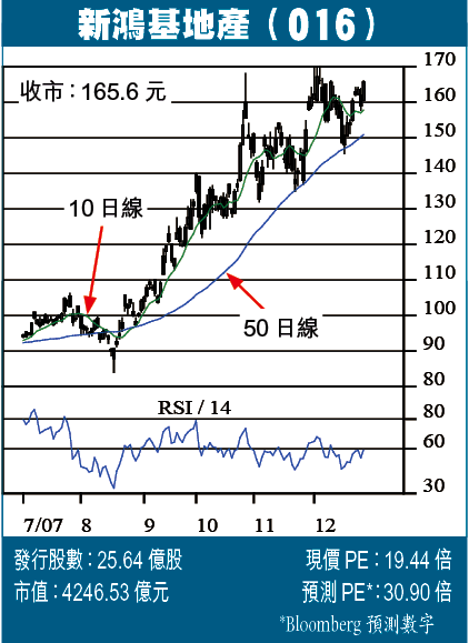 除了核心組合外,筆者今年也會吸納一些本港地產股,除新地外,信置(083)、太古A(019)及九倉(004)相信是不錯的選擇。此外,內地的電力股也頗具投資價值,尤其是市盈率最低那一間,除了有母公司注資概念外,「兩稅合一」亦會令其稅率下降,而增加盈利。