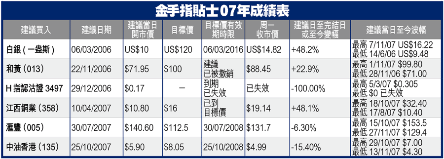 08年第一個交易日,係時候總結金手指篤過嘅「一注獨贏」貼士。07年嘅表現,附表清楚顯示。跟住我會講吓08年嘅展望。