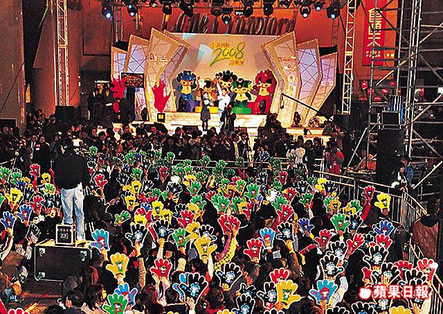 【本報訊】踏入2008奧運年,香港作為奧運協辦城市,昨晚的倒數活動也加插了迎奧運色彩。逾5,000名市民昨晚在時代廣場參加「全港倒數2008迎奧運」活動,主辦單位向參加市民派發奧運五環圖案的紙眼鏡和寫着奧運字句的大手板,連現場女郎穿的聖誕大衣,上面也寫着北京奧運的字樣。