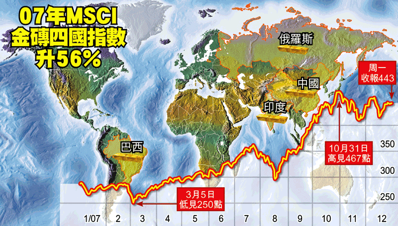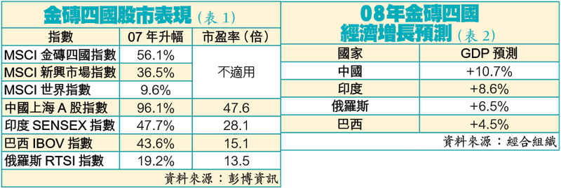 全球股市受美國次按風暴拖累,相繼出現調整,但新興市場中的金磚四國(BRIC,即巴西、俄羅斯、印度及中國)股市表現仍然凌厲,遠超MSCI新興市場指數的37%,及MSCI世界指數的10%。08年全球投資焦點仍是新興市場,巴俄印中4國依然是首選,專家預料今年金磚四國基金會再增長兩成。