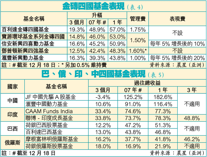 例子:去年5隻金磚四國基金中,以百利達金磚四國基金的表現最理想,錄得49%升幅(表4)。若能承受較高風險,可投資個別金磚四國,當中表現最好的JF中國先驅A股基金,去年升幅近1.3倍(表5)。
