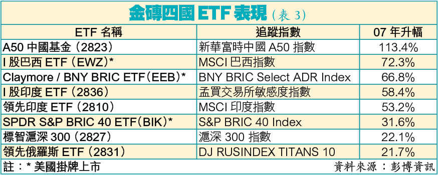 例子:去年金磚四國ETF表現強勁,Claymore/BNYBRICETF全年錄得67%升幅(表3),跑贏傳統開放式金磚四國基金。