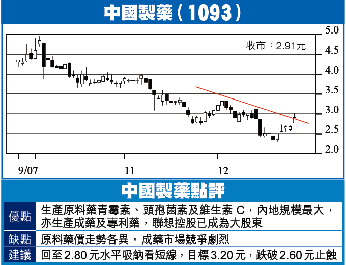 中國製藥(1093)經過06年的橫行整固,去年業務復蘇,配合聯想控股的收購,創出歷史性高價4.95元,但僅以2.91元收市,與高位有相當距離。