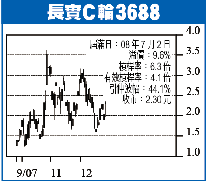 長實C輪3688:長實(001)昨收144.20元,升成5巴仙,半日成交嘅水平唔算低,如果花旗股市冇乜不利變化,假後應該可以繼續推高,炒上睇160元,可以買啲C輪3688短炒。隻輪昨收2.30元,槓桿率6.3倍(有效4.1倍),對冲值0.65,正股升上160元,3688應該唔會低過3.43元,正股跌穿137元止蝕。