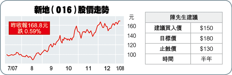 馬鞍山陳生推介新鴻基地產(016),佢話:「之前買過長實(001),今次睇新地,諗住喺150蚊入,但係等唔到呢個位。」新地噚日收報168.8蚊,跌1蚊,對上一次跌破150蚊已經係舊年12月17日,當時收報148.9蚊。