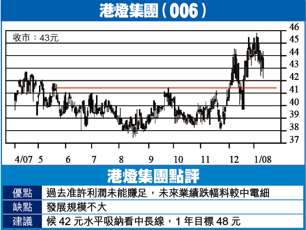 港燈現價43元,預期07年PE12.6倍,息率4.4厘,09年PE約14.3倍,大致與中電相似,根據慣例,港燈的PE較中電為低,而息率則較高,是發展規模的影響,協議達成後,業績雖難免倒退,但展望明朗,已可候低吸納看中長線,但相信未來將跑輸中電,以收息為主。