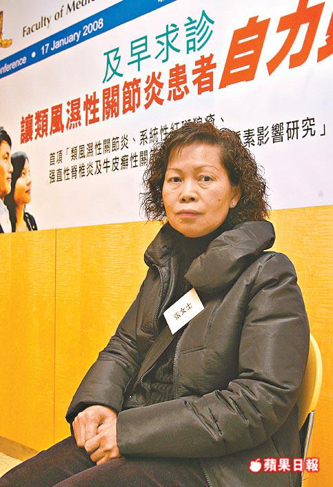 張女士(58歲)十多年前患類風濕性關節炎,病發前從事搬運工作,曾出現肩膀及手腕疼痛等病徵,初時誤以為是工作扭傷,曾看跌打及西醫,並由搬運工作改為負責伙食,但病情在兩年間不斷惡化,頸、膝、腳眼及手指等關節疼痛加劇,「隻手腫到連刀都揸唔到,腳痛到落唔到街」,最後被迫辭去工作,更患上抑鬱症,去年1月接受B細胞生物製劑治療後,腫痛全消,現時更可約朋友外出散心。