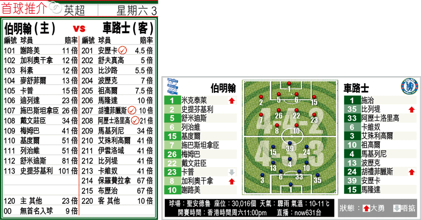 伯明翰上仗作客迫和阿仙奴,防守力確值得一讚,不過此軍主場出擊,尤其是面對強隊,則有進退失據之感;今季伯明翰主場取得3勝3和4負,4場輸波包括曼聯、阿士東維拉等,均屬聯賽榜前10位球隊,反而只擊敗韋根、保頓等下游對手,今仗雖然有新加盟的前鋒麥法頓及後衞大衛梅菲可以披甲,但遇上穩站第3位的車路士,更難樂觀;不過伯明翰韌力不俗,主場4場敗仗中,有3次為僅負1球,包括0:1不敵曼聯,考慮車路士後防未算穩健,3.3倍「讓球主客和」「和局」值敲。文:牽牛