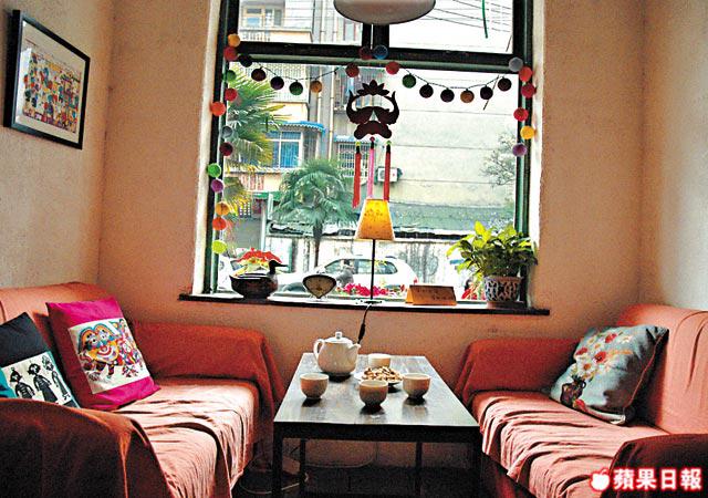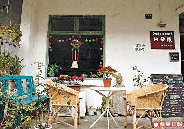 原來店子裏的陳設全出於朵朵的意念,每面牆壁,甚至是地板的木條,都是她親手油漆及釘下去的,說起來卻像是做個小手工一樣不經意。在這裏,朵朵才是大老闆,老公才是老闆娘,「雜工」跟「小二」。我們朋友三人在店子裏出出入入拍照,又摸又揭她的擺設,撩她的客人傾偈,她都沒所謂似的。她只是輕輕的放下茶杯跟小餅亁,就走開了。然後坐在牆角一張鋪有雲南咕𠱸的椅子上發呆。