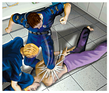1)兩名警員強行拖他到醫療室,將他綁在一張櫈上,然後用電槍電擊他,在13分鐘內,他遭電擊至少11次