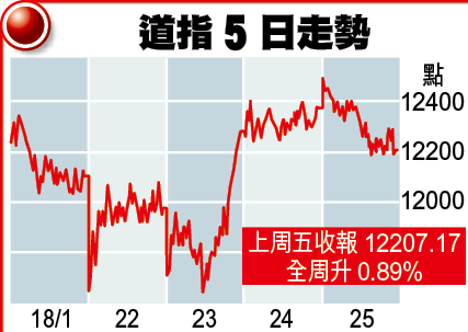 由於微軟和機械生產商Caterpillar業績理想,道指上周五早段漲108點,其後有分析師指,比利時最大金融機構富通或須為次按證券額外減值,加上早前急升的銀行股出現回吐,令道指收市倒跌171點或1.4%,至12207點;納斯達克綜合指數挫34點或1.5%,收報2326點;標準普爾500指數亦跌21點或1.6%,收報1330點。