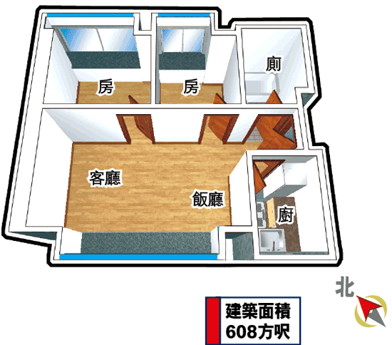 全屋四正,客飯廳面積約160方呎,地方見使。兩房靠邊,無走廊位,內櫳一大一小,惟細房的骰,擺放睡床及衣櫃後,再難容下其他家具。廚廁分設玄關兩旁,地方不大,廚房勝在有窗可看海,惟浴室無窗,空氣不流通。