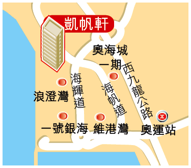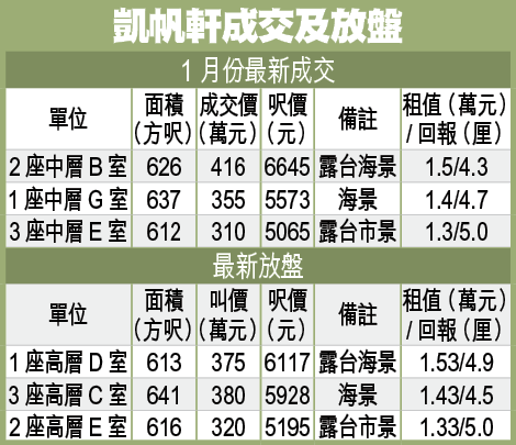 中原盧偉華表示,凱帆軒距港鐵奧運站最遠,樓價亦較低,吸引買家追落後,造就1月市況續旺,半個月有24宗成交,買家吸納海景單位為主,比例達八成,呎價5500至6600餘元;後排單位望深水埗遠景,平均呎價5200元。