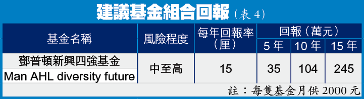 以上兩隻基金每年回報約15至20厘,風險屬中高程度(表4),預計15年後總回報可達490萬元。