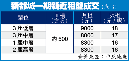 以現時新都城一期同類單位為例,一般租金約8800元(表3),至於九龍城一般約500方呎單位,全包租金只需約7500元,多賺的1300元,可補貼供樓;但就不能享受會所等配套設施。