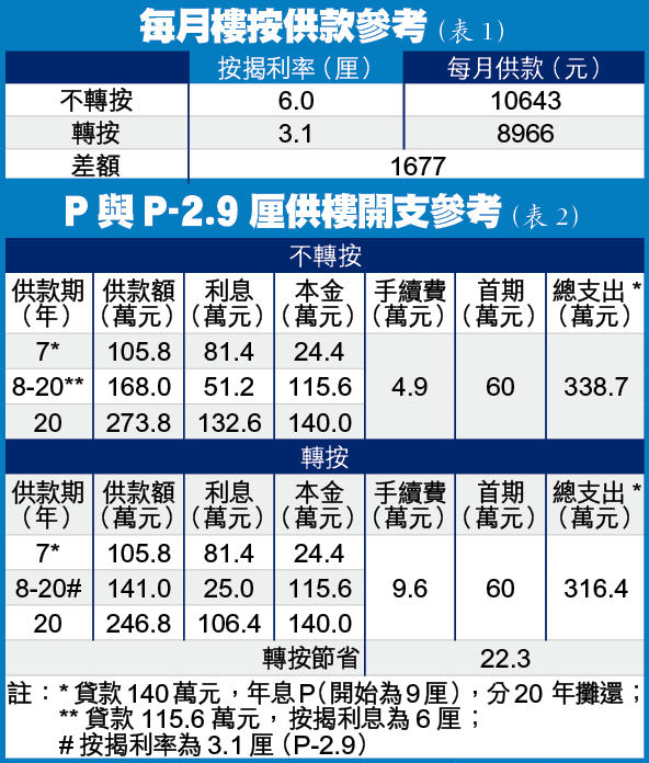為減少利息開支,張佩儀建議李生做物業轉按,以中銀P減2.9厘計,實際按息為3.1厘。以貸款額115.6萬,分13年攤還計,每月供款8966元,較原有的每月10643元供款,節省1677元(表1);而全部供款額為338.7萬元(計及所有支出),較原有不轉按計劃節省22.3萬元(表2)。