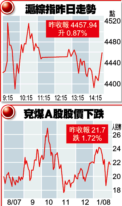 交通運輸因暴風雪幾近癱瘓。中國煤炭運輸協會統計,全國現貨煤價年初至今升近20%。發改委雖強調不能讓小煤礦復產應急,但亦首次指出不排除調控煤價,因早前限制的主要是直接涉及民生的油電氣和糧油食品價格。電煤儲量較多的兗州煤(1171)A股收報跌1.72%。