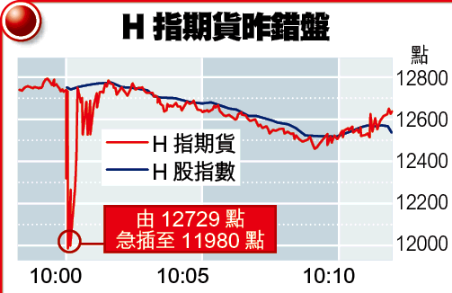 昨日開市頭一分鐘,H股指數期貨即突然由12729,急插749點,至11980,正當大家以為是內地有甚麼不利傳聞,或受上海A股拖累,驚魂未定之際,期貨已急速V形回彈630點,原來是一家證券行交易員輸錯盤,並引發一連串恐慌骨牌沽盤所致。