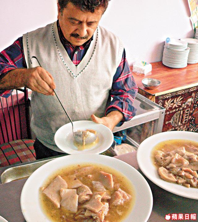 清晨的杜古拜亞斯小城格外低溫,男士們身穿薄衣都可以在街上步履自如,難道他們身上像我一樣貼滿暖包?跟着導遊來到市中心的小餐廳,店內清一色男人,個個埋頭對着碗奶白色的湯起勢吃,原來謎底就在這湯子裏。「這個羊肚羊腿湯用了三小時烹煮,只有清晨4am到9am可以吃到,有時8am就賣光。」導遊說。那邊廂廚師又捧着一大盆羊湯出來賣,只見𢳂完一碗又一碗,其他的豆湯、肉湯甚少人問津,導遊教要加上蒜茸汁和檸檬汁來吃,趁熱吃一口,羊肚彈牙,羶味濃郁,團友受不了想吐出來,只見我和其他人吃得津津有味,他惟有轉吃豆湯,再來一杯當地男人最愛的茶,同樣有暖身之效。「這裏的羊肉平伊斯坦堡三成,加上地處嚴寒之地,我們都習慣三餐食羊。」導遊說。