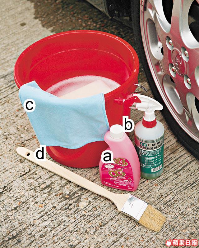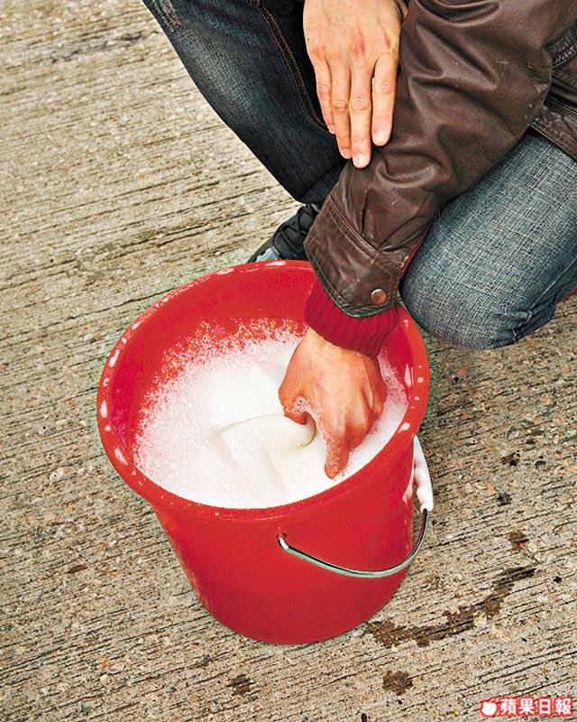 用水開洗車液,份量大概20比1,將海綿浸入,記得用手多揑幾下,令泡沫增加,咁會更有效帶走污物。然後擦勻車身,至於廠徽同門把呢啲細緻位,用油漆掃清潔就最啱。
