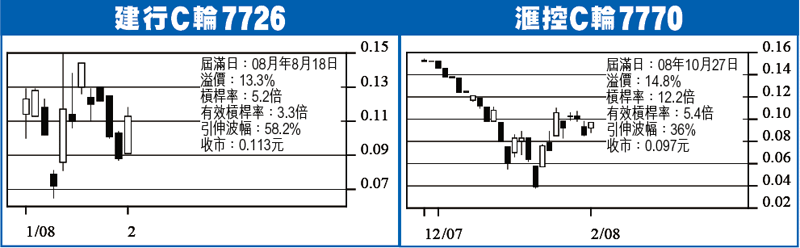 ■建行C輪7726收0.113元,升0.025元,成交2110球。此輪08年8月18日到期,行使價5.50元,溢價13.3%,槓桿率5.2倍,有效3.3倍,引伸波幅58.2%,街貨8.2%。正股見6.60元,此輪轉回價內,貼價兼數據好,理論價0.166元,升47%。