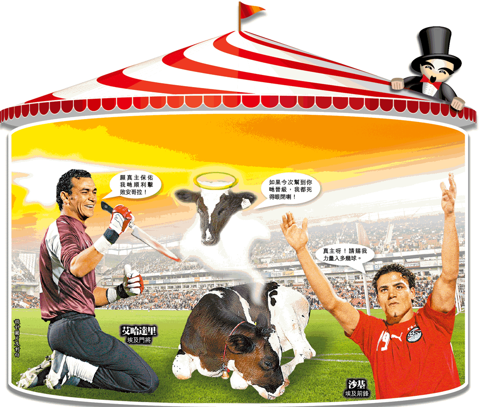 啲人好殘忍?隻牛好可憐?呢啲只不過係CultureShock(文化衝擊)啫。好似我哋拜神最鍾意切燒豬(仲要成隻上),啲鬼佬睇見豬眼同豬鼻,都會覺得好恐怖喇!係咪?希望埃及球員祈福之後,周一順利擊敗安哥拉,等呢隻白色帶黑點嘅牛牛,唔好白白犧牲就好喇!