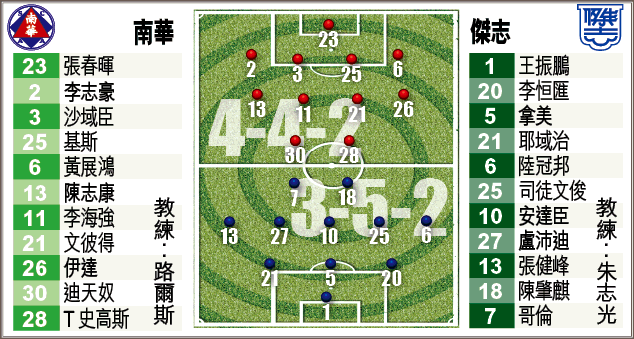 由於南華分組賽餘下兩場對傑志及愉園,如此戰未能全取3分,爭出線便有危機,而羅傑承表示此仗許勝不許和。中堅陳偉豪因停賽缺陣,估計將續由沙域臣與基斯任中堅。事實上,兩強季內已先後對陣3次,傑志2勝1負,南華最近一次碰頭以5球狂數傑志。