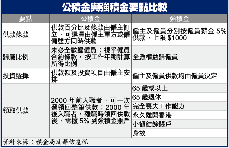 另外,打工仔要留意,強積金計劃成員可自行揀選投資組合,例如股票基金、債券基金及增長基金等,投資項目受到強積金條件限制。至於公積金計劃成員,投資選擇權通常由僱主決定,投資項目範圍較廣,不受強積金條例所限,若公司條例許可,僱員更可投資房地產項目。