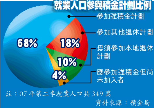 強積金未推出之前,部份公司透過公積金為僱員提供退休福利,同時增加僱員的歸屬感;時至今日,強積金雖然已成為退休計劃的主流,但仍然有公司提供公積金計劃讓僱員選擇。根據積金局資料顯示,本港就業人口中,約有18%僱員參加強積金以外的退休計劃(見圖)。