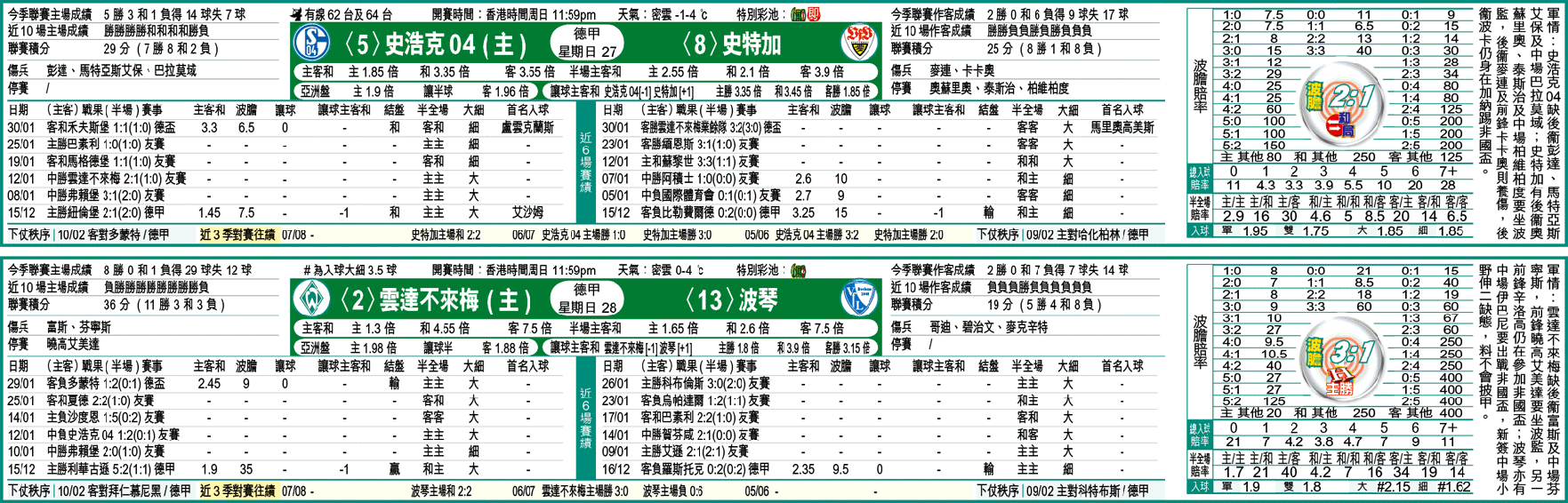 剛在德盃出局的史浩克04,周日在德甲主場對超殘陣的史特加,可望重振聲威;史浩克W有1.85倍,值得捧場。(球賽編號:星期日27;有線62及64台今日11:59pm直播)