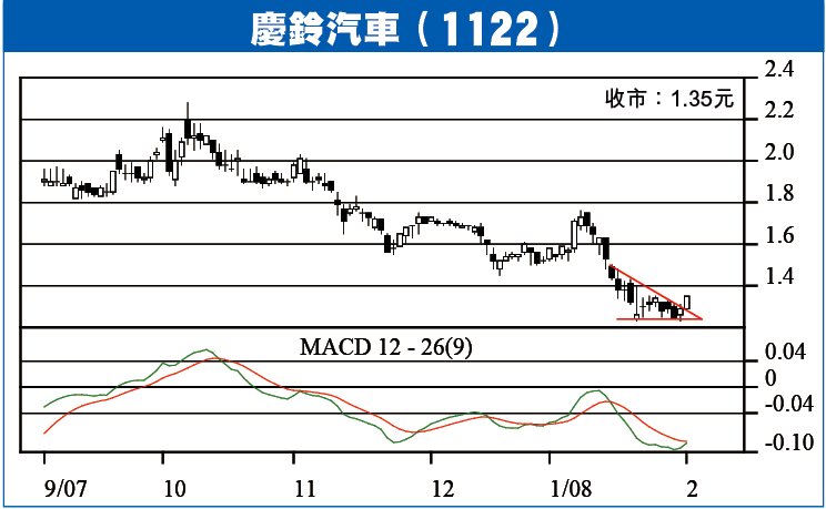 慶鈴汽車(1122)上周五收1.35元,升4.6%,股價早前急挫至1.23,以「長身倒轉錘」形態完成跌勢,股價隨後於1.25元至1.35元之間反覆整固,成交縮減,上周五股價向上突破楔形,成交增加,技術上已展開反彈浪,料會先上試1.43元,破位再試1.55元。