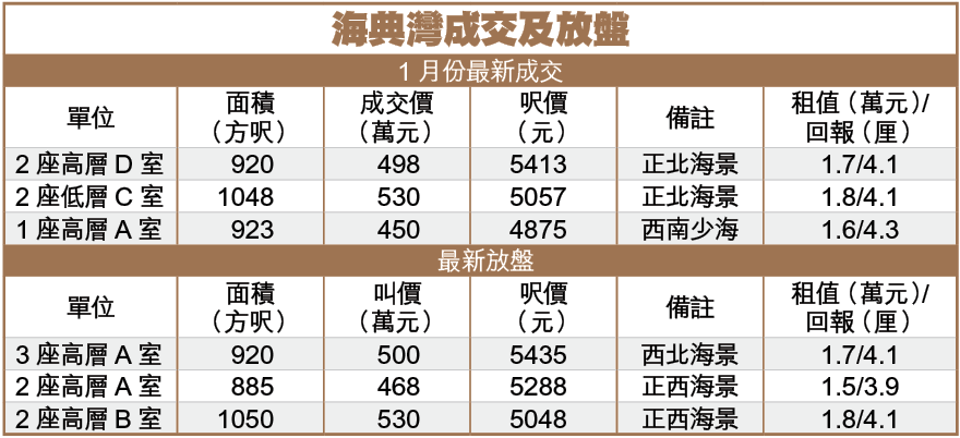 馬鞍山海典灣一如區內其他臨海屋苑,坐擁全海景優勢,雖然第3及5座向北正對地盤,是長實06年投得的住宅地皮,但早前該地盤只獲批興建洋房及樓高24層住宅,令海典灣3及5座高層戶海景變得有保障,如介紹的5座極高層A室,開價即時調升5%。