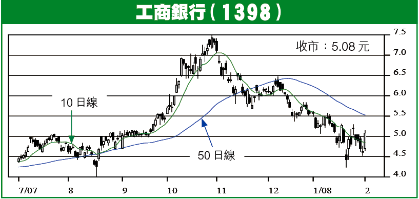 工商銀行(1398)早前發出盈喜,按中國會計準則,07年度純利將較去年同期增加60%。雖然08年貸款增長將放緩,但在兩稅合併及非利息業務持續增長的幫助下,料08年度盈利仍有20%增長,預計PE約15倍,估值吸引,可候5元以下吸納,目標5.7元,止蝕位4.5元。