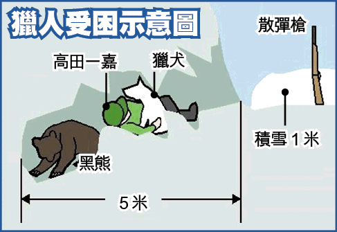 高田有30年以上打獵經驗,他說:「洞口很闊,中間收窄,他想捕捉黑熊才鑽進去。」他足足被困了24小時,洞內氣溫只有-10℃,他說幸好能抱着獵犬取暖,才能保住性命。