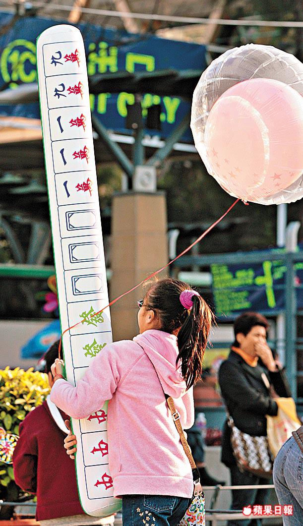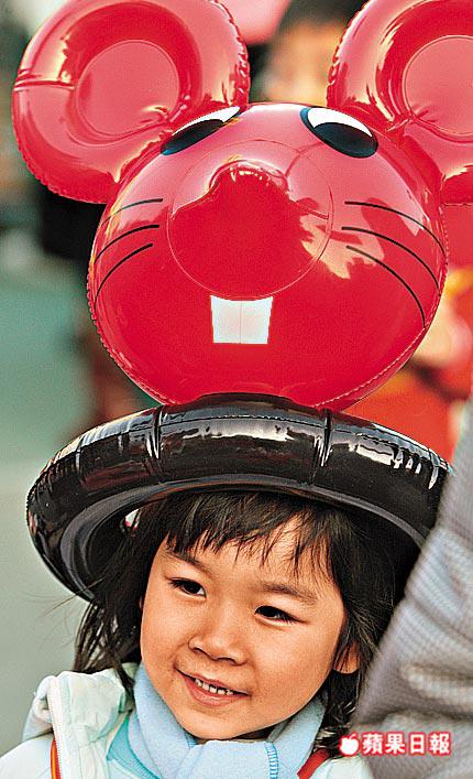 有家長為小朋友扮成米奇老鼠行年宵,再戴上老鼠大耳朵頭飾拍照留念。張祝珊英文中學學生推出老鼠吹氣坐墊「芝心鼠」,記者所見,只要小朋友喜歡,父母絕不手軟,賣來送給子女作新年禮物。