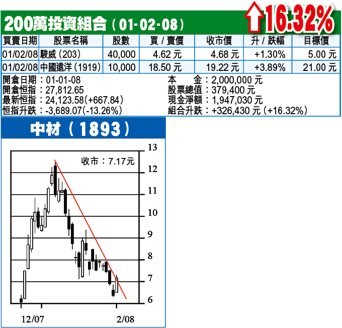 內地雪災未息,股市已開始炒災後重建,水泥股和原材料股均見異動。早前本組合炒過的中材股份(1893),上周五扭轉近期跌勢,大幅反彈,剛微破降軌阻力,現價可追入短炒,目標價8.5元。
