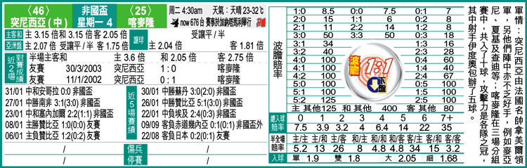 「讓球」喀麥隆讓平手/半球,取突尼西亞下盤;而基於他們兩隊近6次交手開出2大4細,故兼補1.68倍入球「細」。