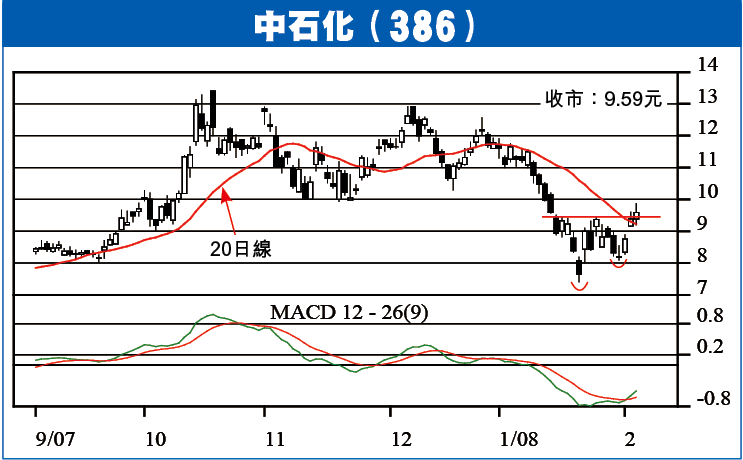 中石化(386)昨收9.59元,升2.1%。在市況轉靜之際,中石化之成交連續第2天增加,股價並確認突破20日線阻力位,下一目標上試10.6元及11元的阻力區,突破11元關將開展大升浪,現時看來條件還未夠成熟,可考慮於10.6至11元之間沽貨獲利。