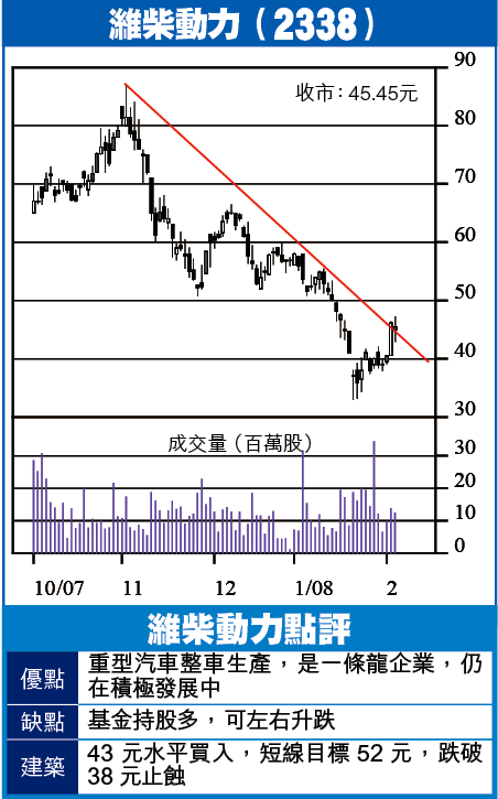 經過一輪急跌後,相信濰柴已完成調整,現價45.45元,如上述估計盈利實現(不考慮商譽撇銷),PE約10.8倍,為汽車及相關行業較低者,由於近期波幅大,暫以候低吸納看短線為主,待形勢轉好,再作中線考慮。
