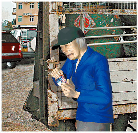 她見尚有幾天便農曆新年,整理居所昔日所拾的紙皮廢料,並電召相熟的廢料回收公司,派貨車前來交收,她將東西逐一推往屋前不遠處小空地等候。