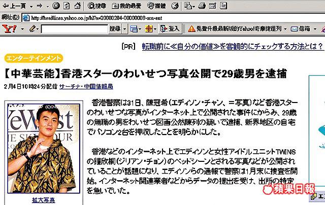 近日的疑似藝人淫照風波不但震撼兩岸三地,就連日韓兩地傳媒及路透社也爭相報道。日本傳媒關心此新聞,是因陳冠希曾演出《無間道》系列電影,加上他與當地不少潮界設計師熟稔,令他在當地頗具有知名度;至於栢芝因主演韓片《白蘭》,也令淫照風波在當地受到關注。前日警方拘捕一名涉嫌發佈淫照的29歲男子及搜查電腦公司,日韓兩地新聞網也有跟進報道相關新聞。