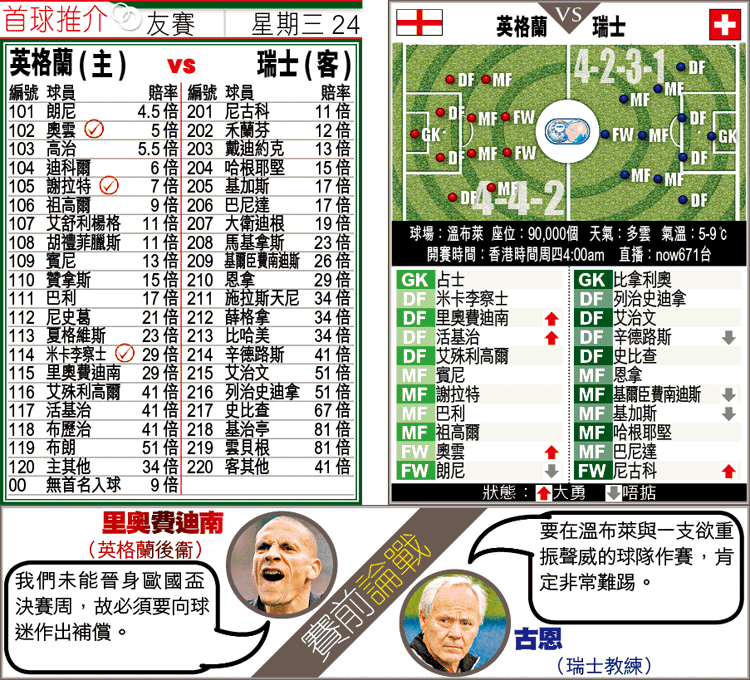可以預期,卡比路會繼續重用艾歷臣及麥卡倫時代的骨幹球員,換言之里奧費廸南、謝拉特、奧雲及朗尼會孭重飛,並負責串連球隊的進攻及防守。此外,雖說朗尼今季狀態平平,開「咧」至今僅入12球,不過英格蘭對上一次對瑞士,便是靠他梅開二度贏3:0。