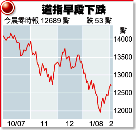 道指早段最多跌106點,見12636點;納斯達克指數曾挫23點,見2389點。開市後個半小時(本港時間凌晨零時),道指報12689點,跌53點;納指報2397點,跌15點。