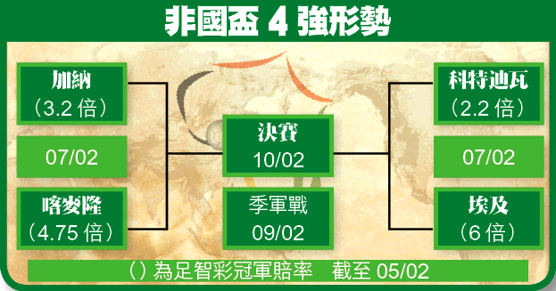 周一戰罷非國盃8強,喀麥隆憑新星麥比亞梅開二度,加時後以3:2淘汰突尼西亞,與主辦國加納爭入決賽;而衞冕的埃及則險勝安哥拉2:1躋身4強,遇上大熱的科特廸瓦!
