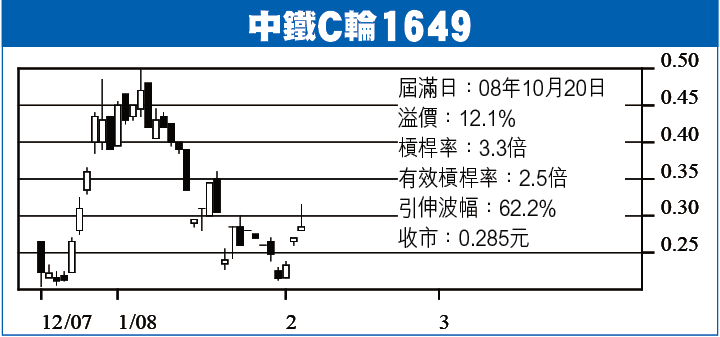 中鐵C輪1649:中鐵(390)昨收9.57元,股價跌咗成個月,呢幾日嘅反彈算幾有力,短線睇11.2元,可以買啲C輪1649「責年」,隻輪昨收28.5仙,槓桿率3.3倍(有效2.5倍)。