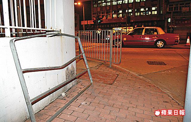 【本報訊】九龍城聯合道昨凌晨發生驚險交通意外。一名年輕男子駕駛三菱LANCE私家車,在交通燈位起步轉彎時,懷疑踩大油門致失控,私家車如脫韁野馬,橫越三條行車線,再撞向路中天橋底鐵欄鏟上安全島,一截鐵欄被撞毀,飛越10米險擊中正推着單車橫過馬路的四名青年。 記者:杜建彬